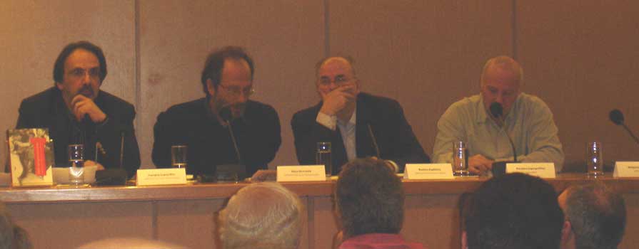 Τρεις καθηγητές της Ιστορίας, ο Σεραφείμ Σεφεριάδης (Πάντειο παν/μιο, πρώτος από αριστερά), ο Νίκος Θεοτοκάς (Πάντειο παν/μιο), και ο Βασίλης Καρδάσης (Παν/μιο Κρήτης) τοποθετήθηκαν ως προς τον τρόπο που βλέπουμε την Ιστορία μέσα από τη μυθοπλασία, με αφορμή, επίκεντρο και συνεχείς αναφορές στο πολυδιαβασμένο πολιτικό μυθιστόρημα του Θανάση Σκρουμπέλου Μπλε καστόρινα παπούτσια. Το γεγονός συνέβη την προηγούμενη Τρίτη (31.03.09) σε μια κατάμεστη αίθουσα (Στοά του βιβλίου) από κόσμο που διψούσε για την ανάγνωση της πολιτικής ιστορίας του τόπου.*