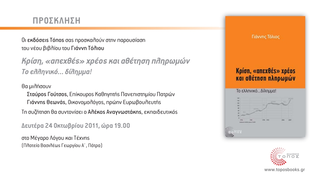 ::. Παρουσίαση του βιβλίου του Γιάννη Τόλιου "Κρίση, απεχθές χρέος και αθέτηση πληρωμών" στην Πάτρα. (24-10-2011 12:45)