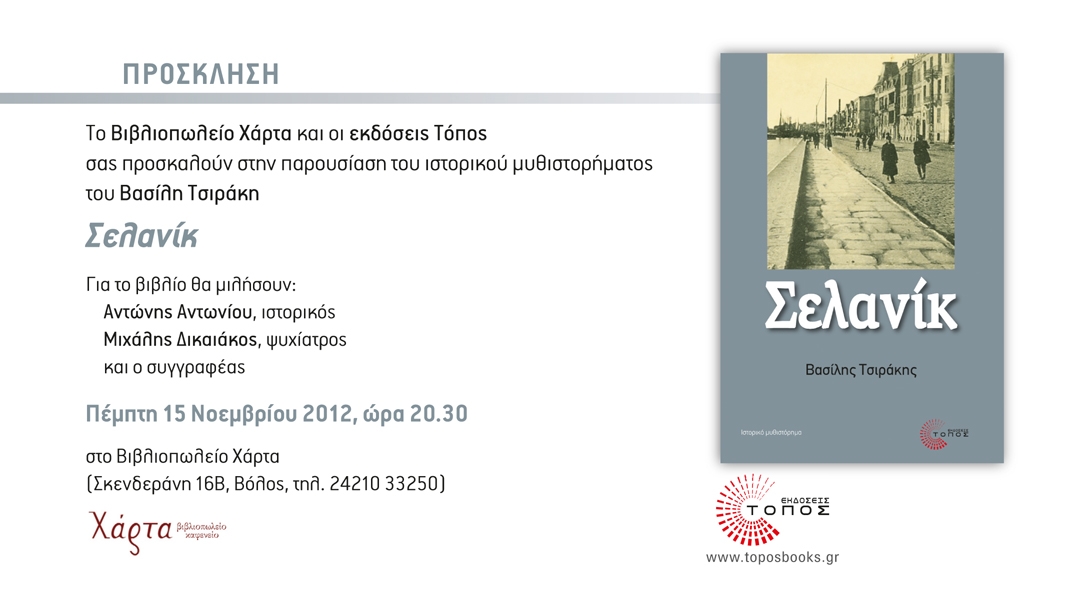 ::. "Σελανίκ": Παρουσίαση του βιβλίου του Β. Τσιράκη στο Βόλο (15 Νοεμβρίου) (12-11-2012 13:22)