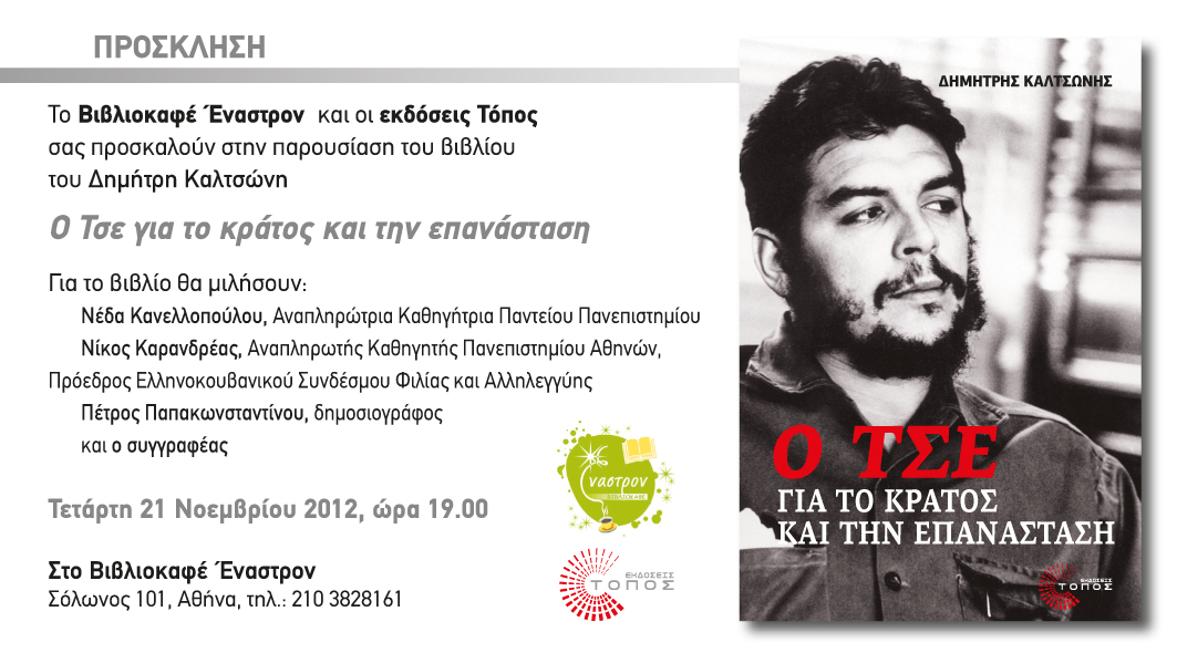 ::. "Ο Τσε για το κράτος και την επανάσταση"- Παρουσίαση του βιβλίου του Δημήτρη Καλτσώνη στο Βιβλιοκαφέ "Έναστρον" (Τετάρτη 21 Νοεμβρίου) (19-11-2012 17:53)
