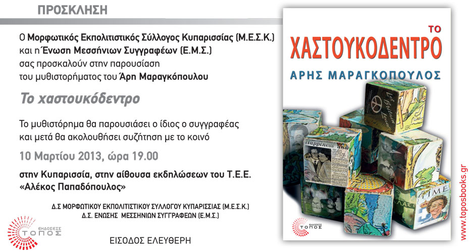 ::. "Το χαστουκόδεντρο"- Παρουσίαση του μυθιστορήματος του Α. Μαραγκόπουλου στην Κυπαρισσία (Κυριακή 10 Μαρτίου) (06-03-2013 12:59)
