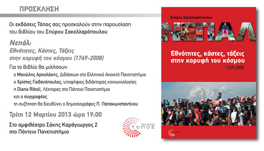 ::. "Νεπάλ: Εθνότητες, Κάστες, Τάξεις στην κορυφή του κόσμου (1769-2008)"- Παρουσίαση του βιβλίου του Σ. Σακελλαρόπουλου στο Πάντειο (Τρίτη 12 Μαρτίου) (06-03-2013 14:18)