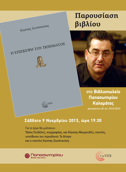 ::. "Η επίσκεψη του ποιήματος": Παρουσίαση της ποιητικής συλλογής του Κώστα Ζωτόπουλου στην Καλαμάτα (Σάββατο 9 Νοεμβρίου) (07-11-2013 16:51)