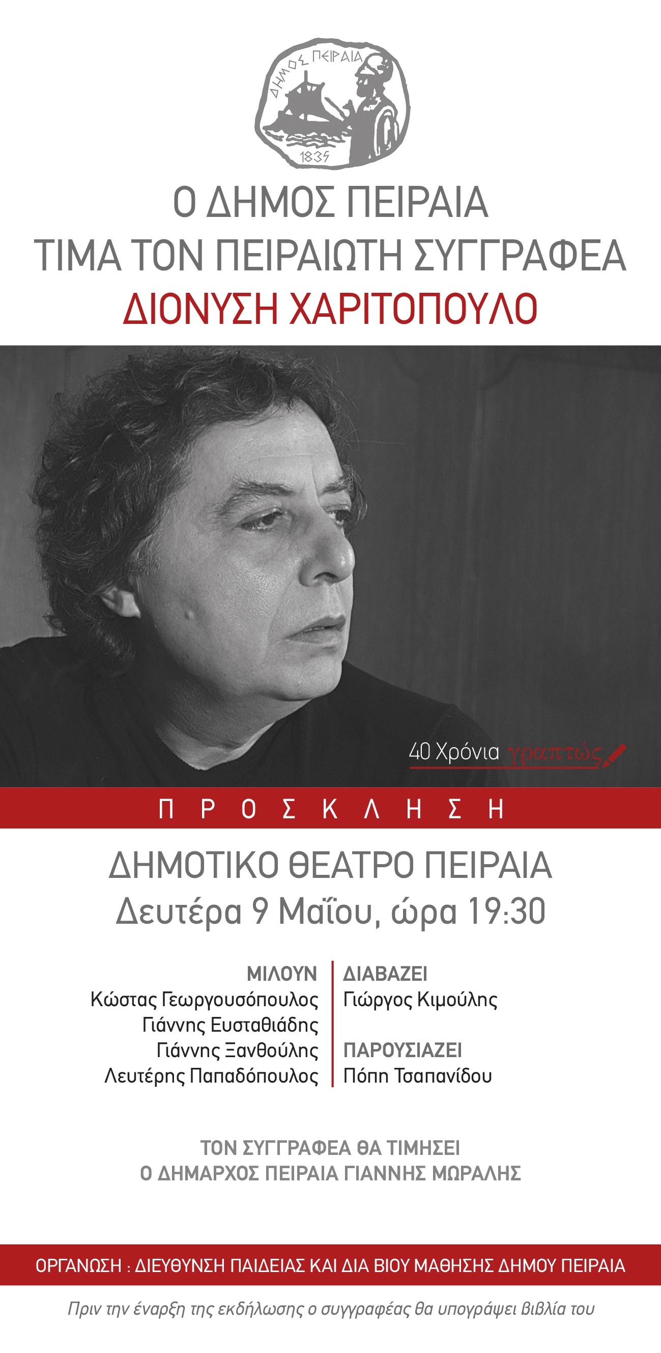 ::. Ο Δήμος Πειραιά τιμά τον Πειραιώτη συγγραφέα Διονύση Χαριτόπουλο: εκδήλωση στο Δημοτικό Θέατρο Πειραιά την Δευτέρα 9 Μαΐου (22-04-2016 13:23)
