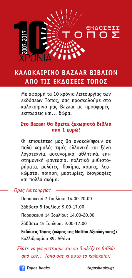 ::. Καλοκαιρινό Bazaar Βιβλίων του Τόπου! 7-8 και 14-15 Ιουλίου, Καλλιδρομίου 89 (04-07-2017 17:58)