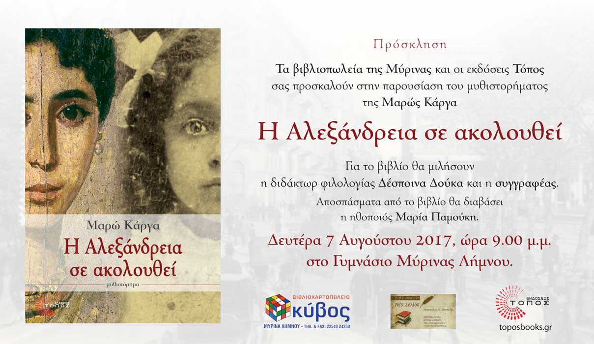 ::. "Η Αλεξάνδρεια σε ακολουθεί": παρουσίαση του μυθιστορήματος της Μ. Κάργα στη Λήμνο τη Δευτέρα 7 Αυγούστου (24-07-2017 13:31)