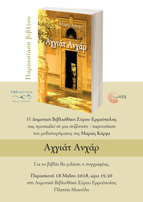 ::. "Αχγιάτ Ανχάρ": παρουσίαση του μυθιστορήματος της Μαρώς Κάργα στη Δημοτική βιβλιοθήκη Σύρου Ερμούπολης την Παρασκευή 18 Μαΐου (08-05-2018 16:36)