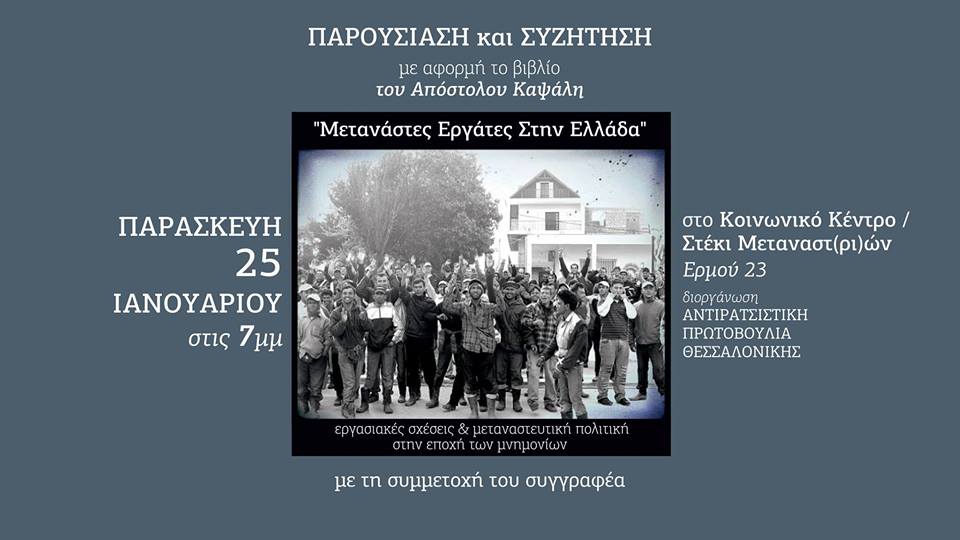 ::. ''Μετανάστες εργάτες στην Ελλάδα'': παρουσίαση του βιβλίου του Α. Καψάλη στη Θεσσαλονίκη, Παρασκευή 25 Ιανουαρίου (21-01-2019 16:51)