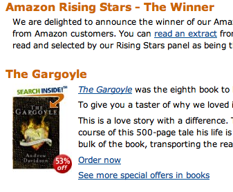 Tα Δαιμόνια του Άντριου Ντέιβιντσον (The Gargoyle) εξακολουθούν να σημειώνουν τη μια μετά την άλλη επιτυχία στο εξωτερικό. Σε λίγες ημέρες (από τη Δευτέρα 13 Οκτωβρίου) το βιβλίο θα εμφανιστεί και στους πάγκους των ελληνικών βιβλιοπωλείων. Στην Αγγλία, όπου το βιβλίο εκδόθηκε σε μορφή paperback μόλις πριν λίγες ημέρες, Τα Δαιμόνια εμφανίζονται στην πρώτη θέση του καταλόγου του «Top 10» (βλ. εικόνα επάνω) κι ακόμα κέρδισαν την πρώτη θέση στην κατηγορία του ανερχόμενου συγγραφέα (Amazon Rising Stars – εικόνα κάτω)!