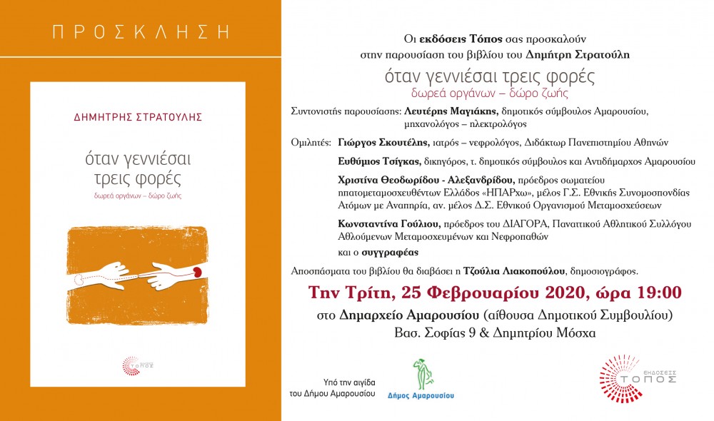 ::. Τρίτη 25 Φεβρουαρίου: '''Οταν γεννιέσαι τρεις φορές'' παρουσίαση του βιβλίου στο Δημαρχείο Αμαρουσίου (06-02-2020 18:05)