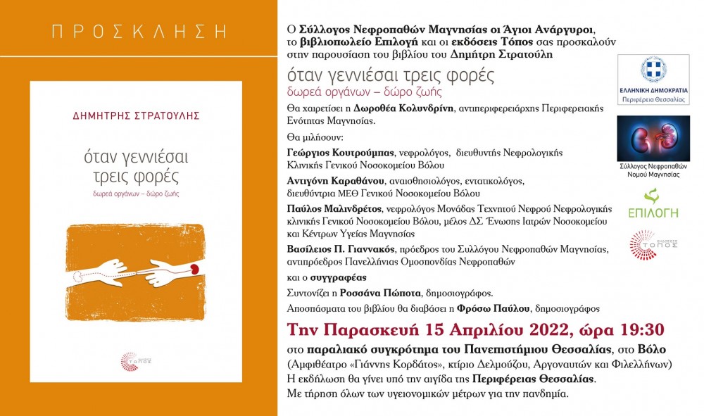 ::. Παρασκευή 15 Απριλίου:''Όταν γεννιέσσαι τρεις φορές'' παρουσίαση του βιβλίου του Δημήτρη Στρατούλη στο Βόλο (08-04-2022 16:19)