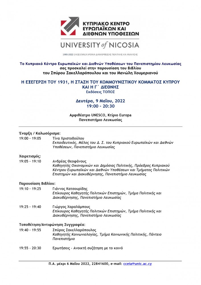 ::. Δευτέρα 9 Μαΐου : ''Η εξέγερση του 1931, η στάση του Κοµµουνιστικού Κόµµατος Κύπρου και η Γ΄ ∆ιεθνής'' παρουσίαση του βιβλίου στο Πανεπιστήμιο Λευκωσίας (29-04-2022 10:37)