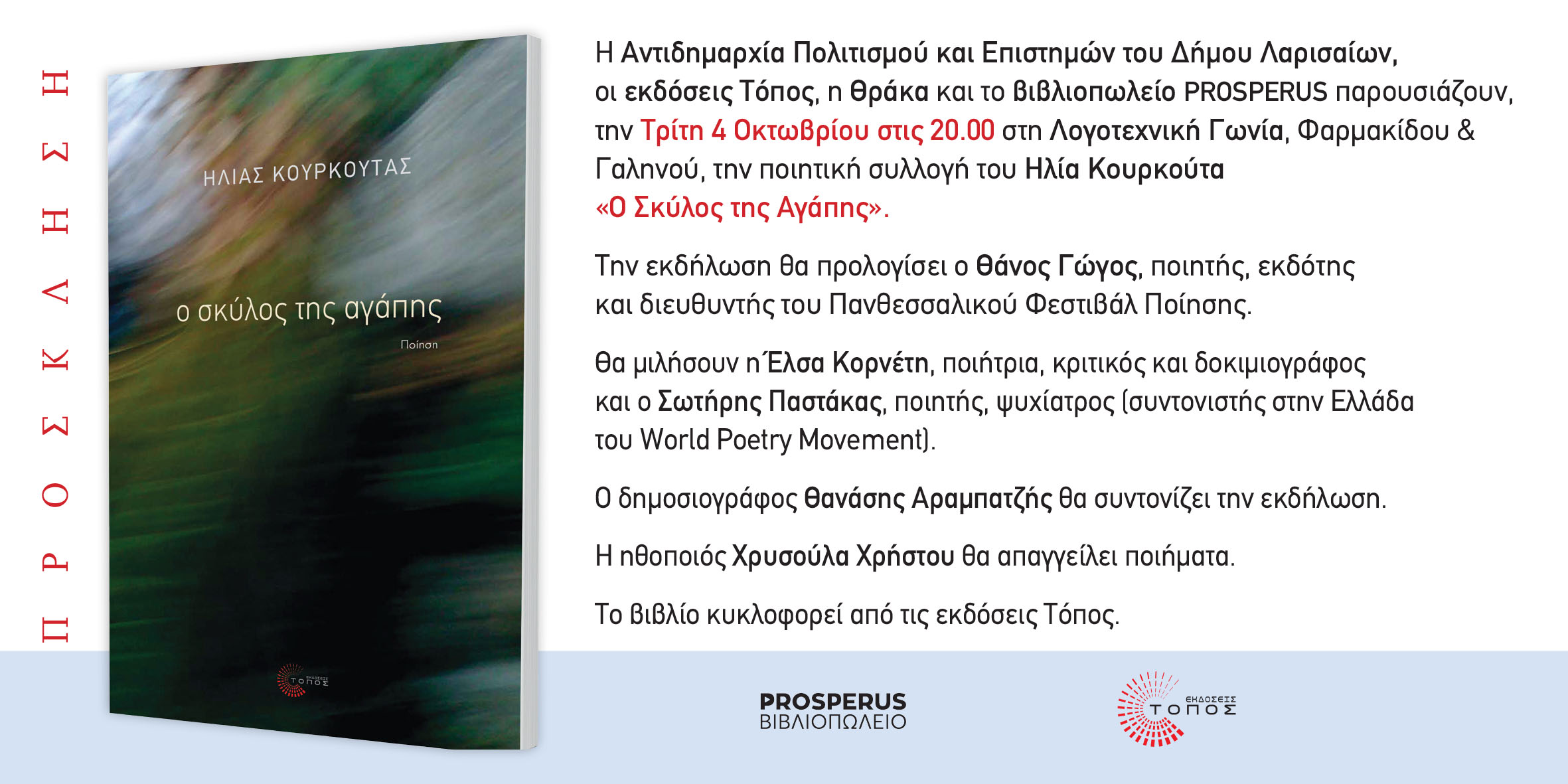 ::. ''Ο σκύλος της αγάπης'' παρουσίαση της ποιητικής συλλογής του Ηλία Κουρκούτα στη Λάρισα, Τρίτη 4 Οκτωβρίου (26-09-2022 17:50)