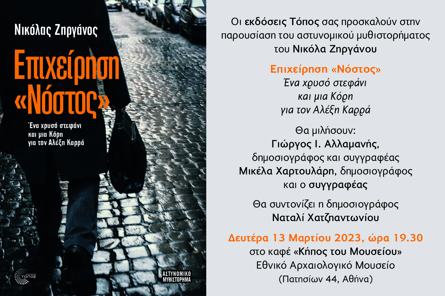 ::. Δευτέρα 13 Μαρτίου: ''Επιχείρηση «Νόστος»'' παρουσίαση του αστυνομικού μυθιστορήματος του Νικόλα Ζηργάνου στην Αθήνα (09-03-2023 13:50)