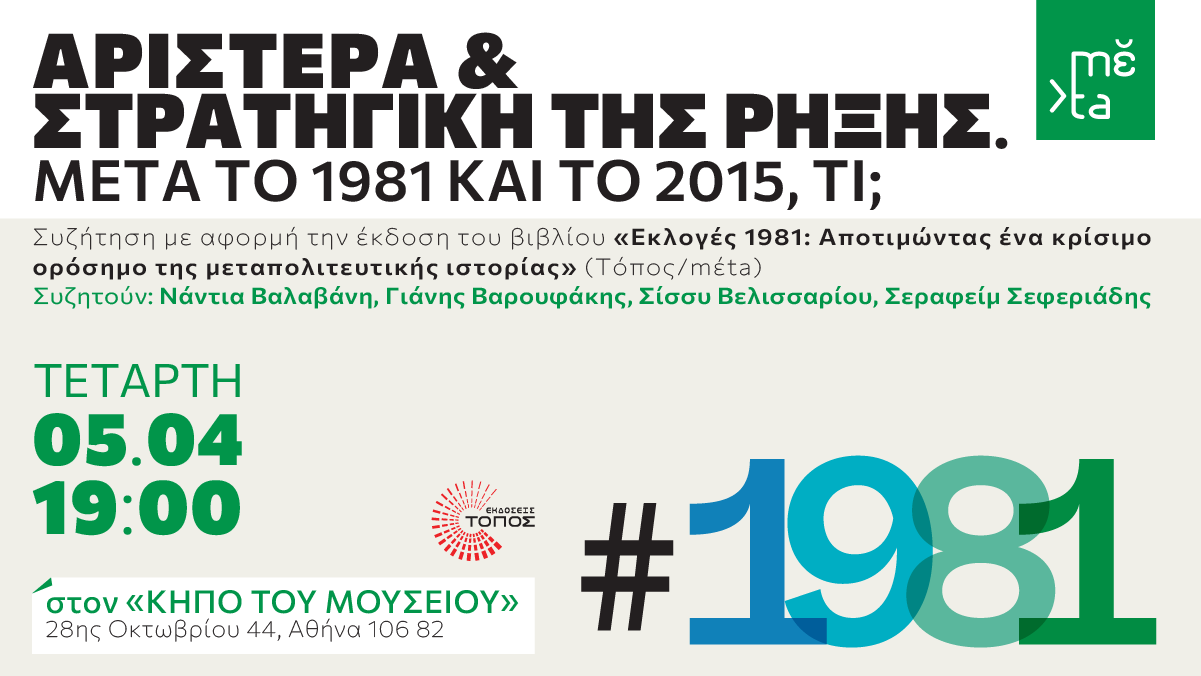 ::. Τετάρτη 05/04: Συζήτηση με αφορμή την έκδοση του βιβλίου «Εκλογές 1981: Αποτιμώντας ένα κρίσιμο ορόσημο της μεταπολιτευτικής ιστορίας» (Εκδόσεις ΤΟΠΟΣ/mέta) (28-03-2023 11:15)