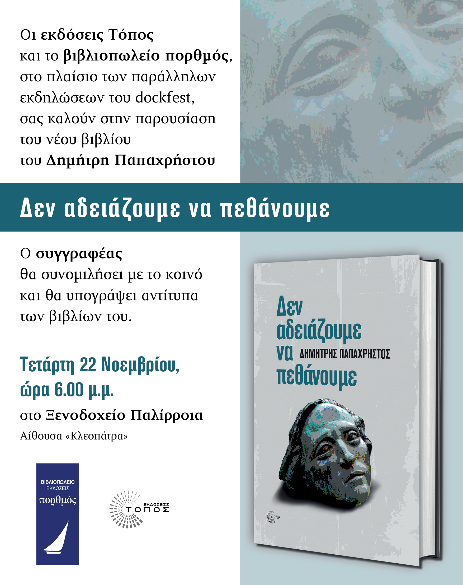 ::. Τετάρτη 22 Νοεμβρίου: ''Δεν αδειάζουμε να πεθάνουμε'' παρουσίαση του νέου βιβλίο του Δημήτρη Παπαχρήστου στην Χαλκίδα (17-11-2023 11:18)