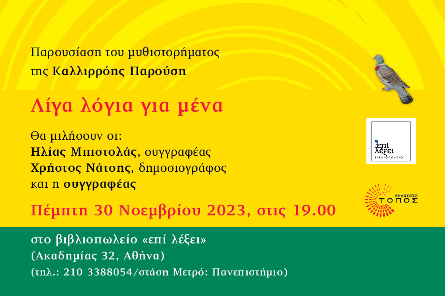 ::. Πέμπτη 30 Νοεμβρίου: ''Λίγα λόγια για μένα'' παρουσίαση του νέου βιβλίου της Καλλιρρόης Παρούση στο βιβλ. ''Επί Λέξει'' (17-11-2023 11:27)