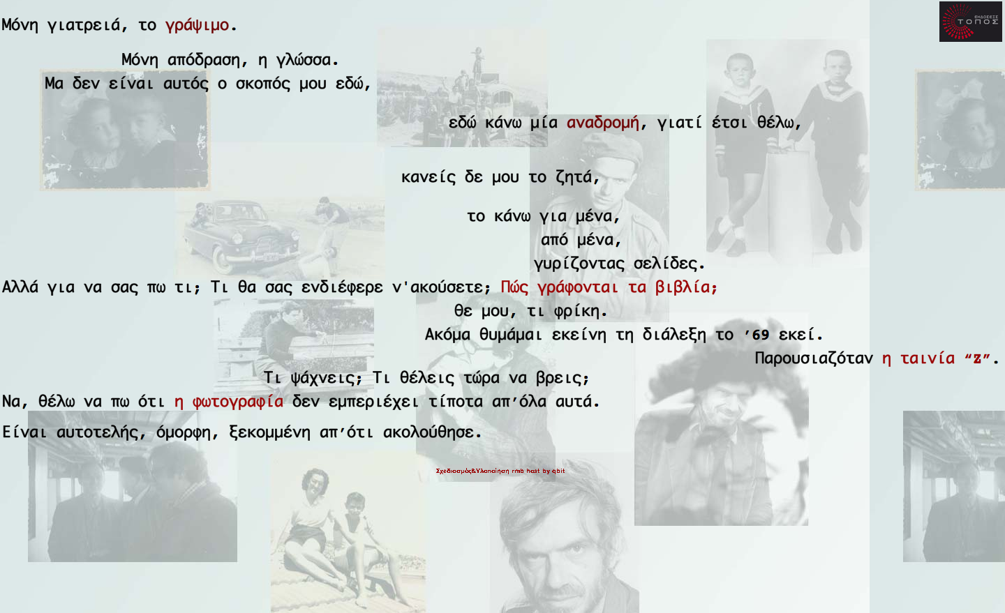 Ένας δικτυακός τόπος χρηστικός για κάθε αναγνώστη αλλά και με σοβαρή φιλολογική υποδομή για όλους όσοι ενδιαφέρονται να γνωρίσουν ουσιαστικότερα τον πιο πολυμεταφρασμένο εν ζωή Έλληνα συγγραφέα.