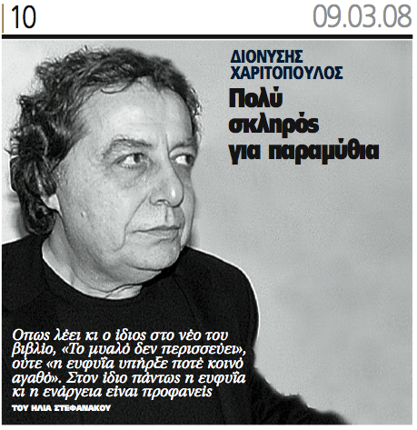 .png) Too tough to offer simple tales is the title of an early praise for the latest book by Dionyssis Charitopoulos as it appeared at the book supplement of the Proto Thema weekend newspaper. |