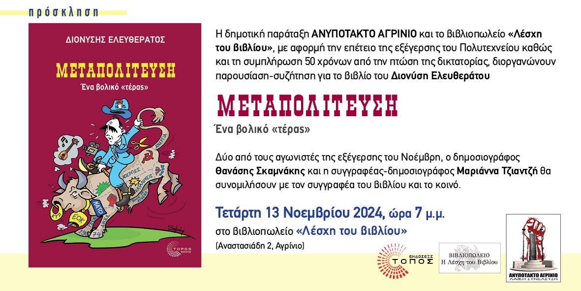 ::. Τετάρτη 13 Νοεμβρίου: ''Μεταπολίτευση'' παρουσίαση του βιβλίου του Διονύση Ελευθεράτου στο Αγρίνιο (23-10-2024 17:14)
