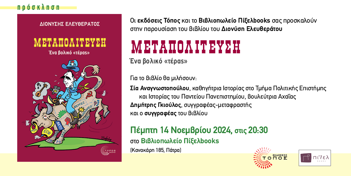 ::. Πέμπτη 14 Νοεμβρίου: ''Μεταπολίτευση'' παρουσίαση του βιβλίου του Διονύση Ελευθεράτου στην Πάτρα (23-10-2024 17:15)