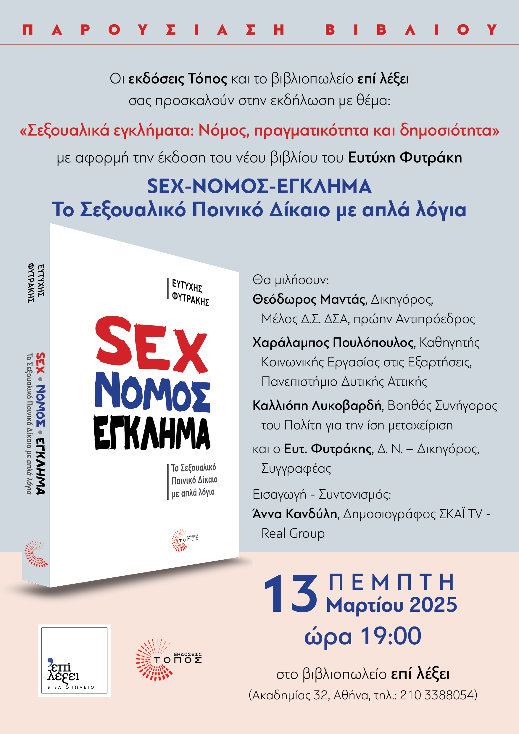 ::. Πέμπτη 13/03 Αθήνα: Εκδήλωση "Σεξουαλικά εγκλήματα: Νόμος, πραγματικότητα και δημοσιότητα'' με αφορμή το βιβλίο του Ευτύχη Φυτράκη "Sex-Νόμος-Έγκλημα" (27-02-2025 17:05)