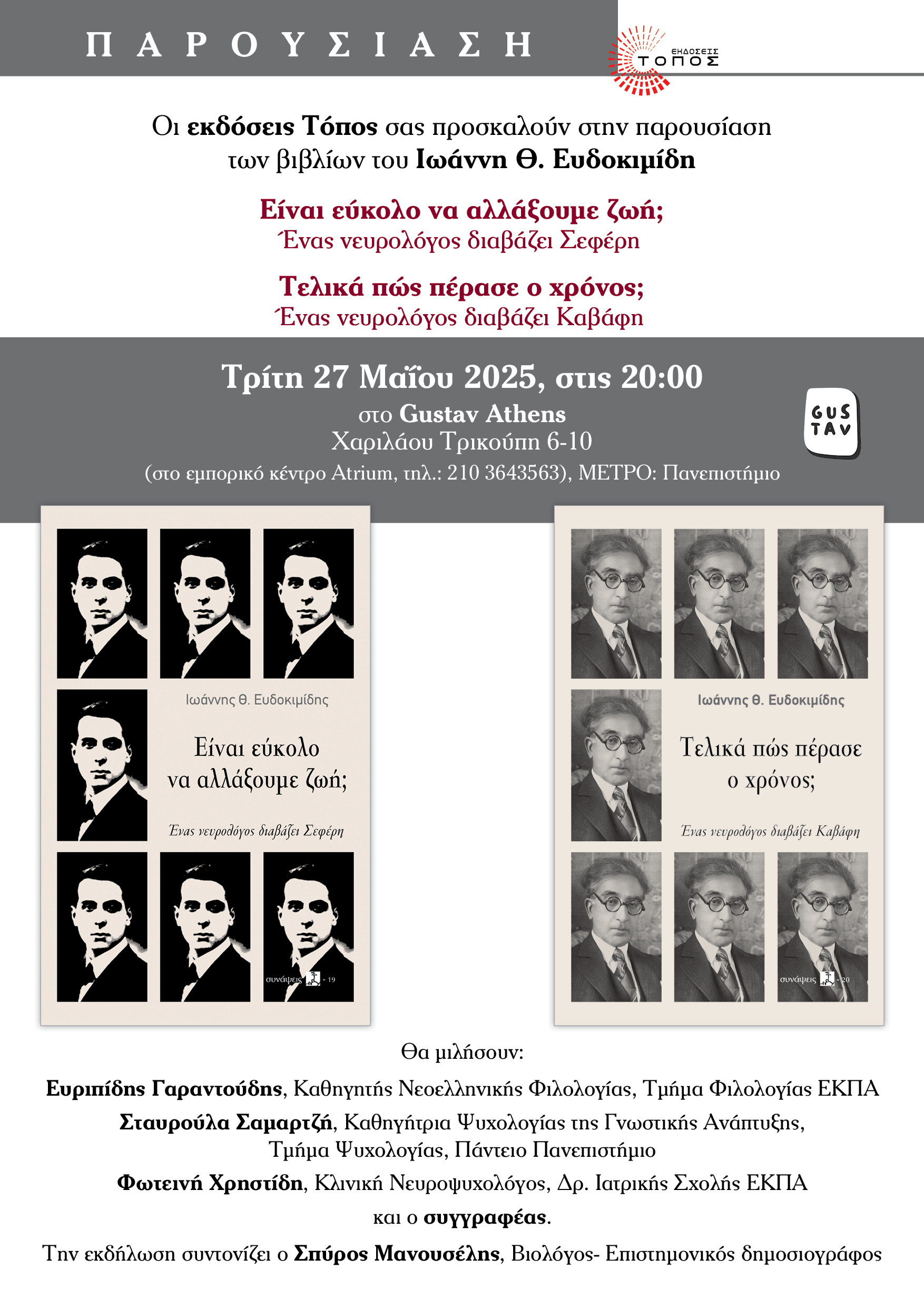 ::. Τρίτη 27 Μαΐου- Gustav Αthens: παρουσίαση των βιβλίων του Ιωάννη Θ. Ευδοκιµίδη στην Αθήνα (19-05-2025 13:20)