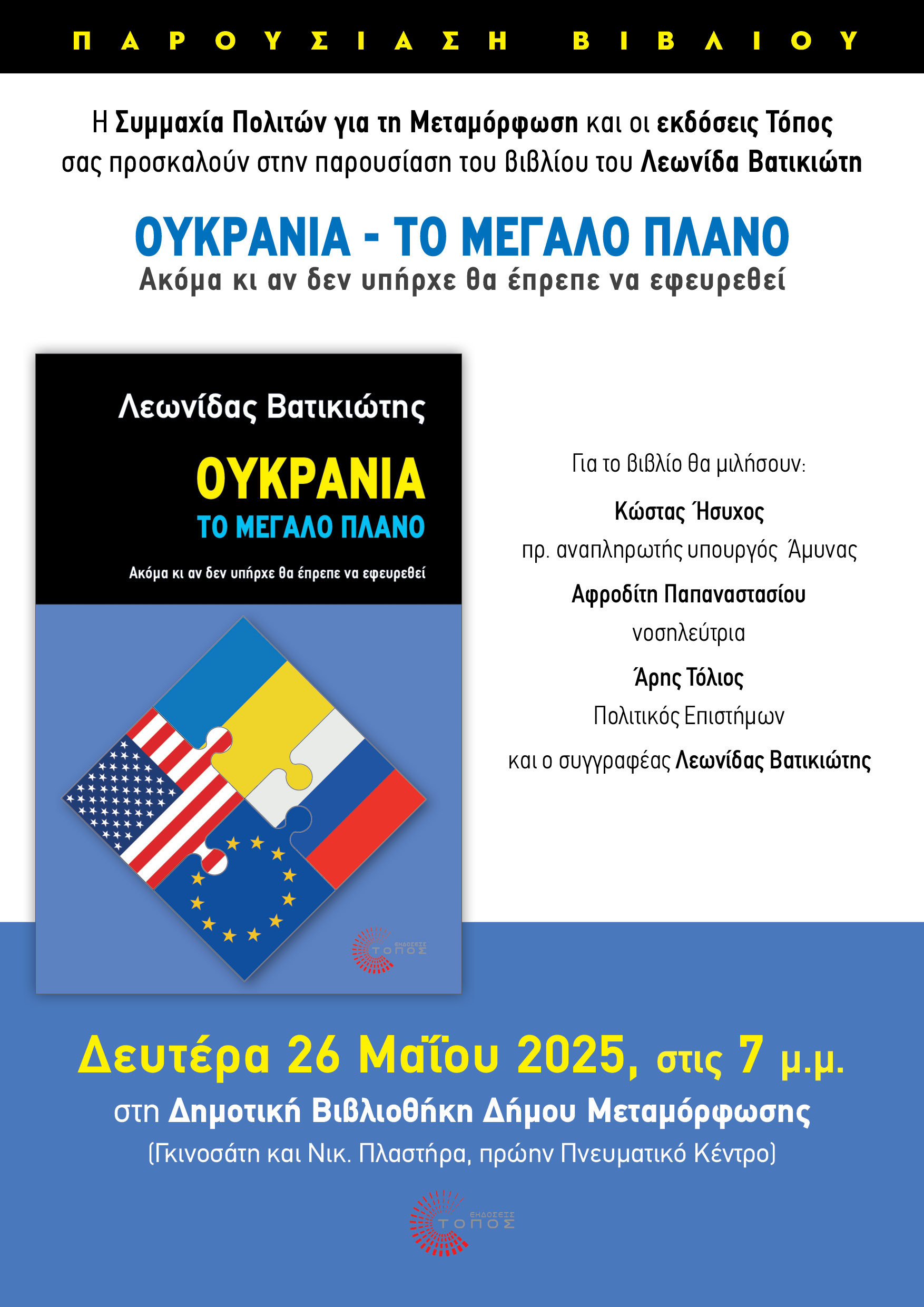 ::. Δευτέρα 26/05 Αθήνα: "Ουκρανία - Το μεγάλο πλάνο" παρουσίαση του βιβλίου του Λεωνίδα Βατικιώτη (21-05-2025 18:40)
