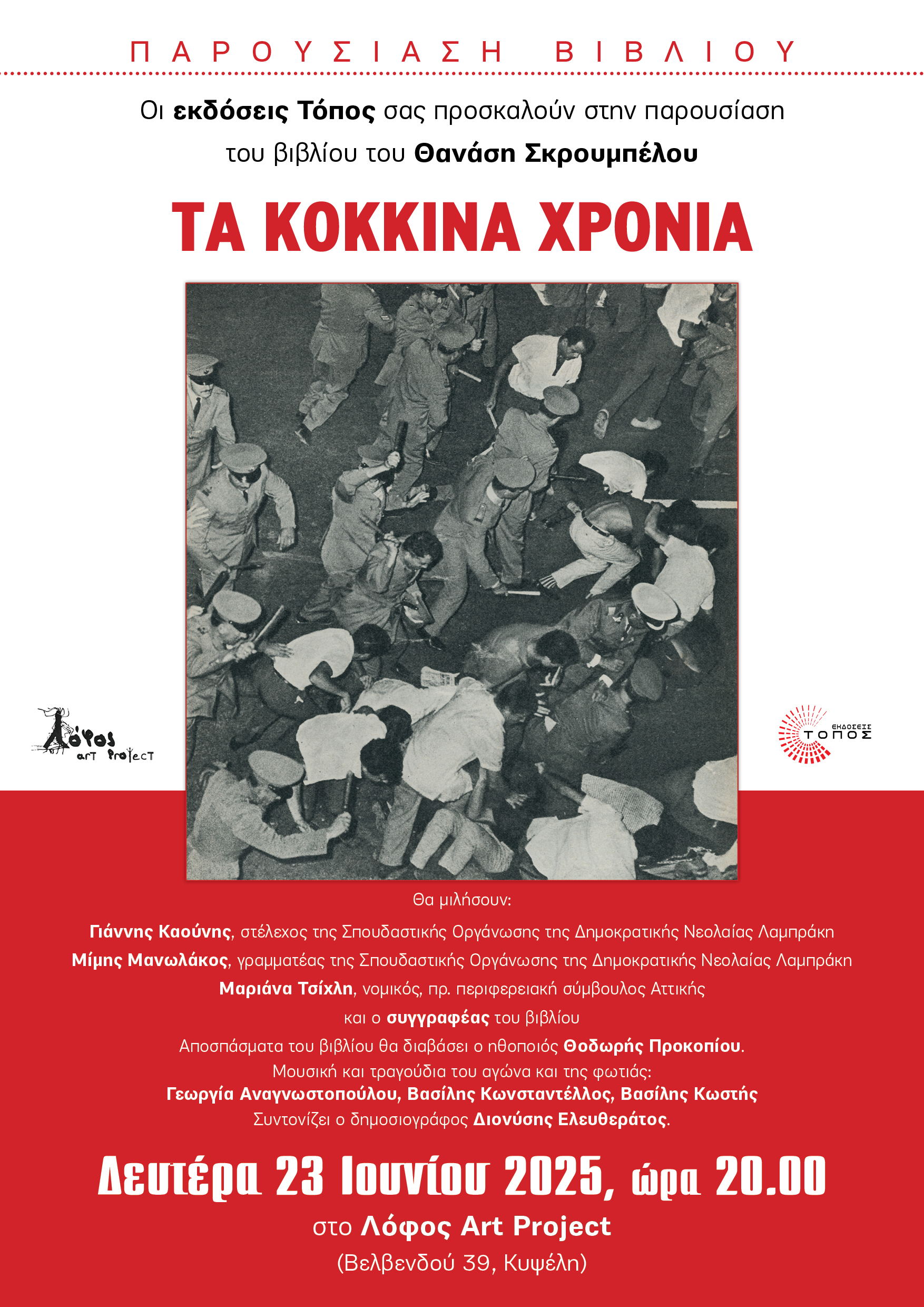 ::. Δευτέρα 23/06 Κυψέλη: "Τα κόκκινα χρόνια" παρουσίαση του νέου βιβλίου του Θανάση Σκρουμπέλου (11-06-2025 14:57)