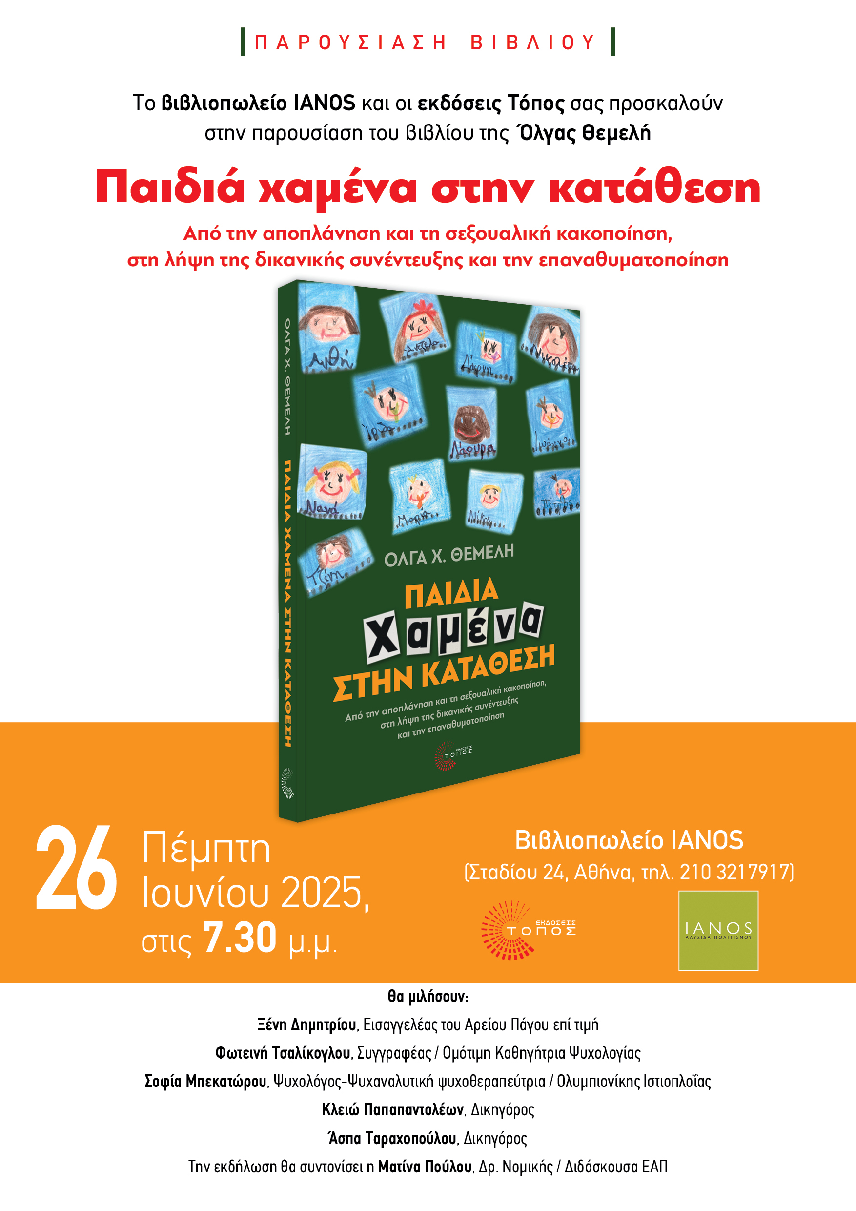 ::. Πέμπτη 26 Ιουνίου,Iανός Αθήνα: ''Παιδιά χαμένα στην κατάθεση''παρουσίαση του βιβλίου της Όλγας Θεμελή (12-06-2025 14:45)