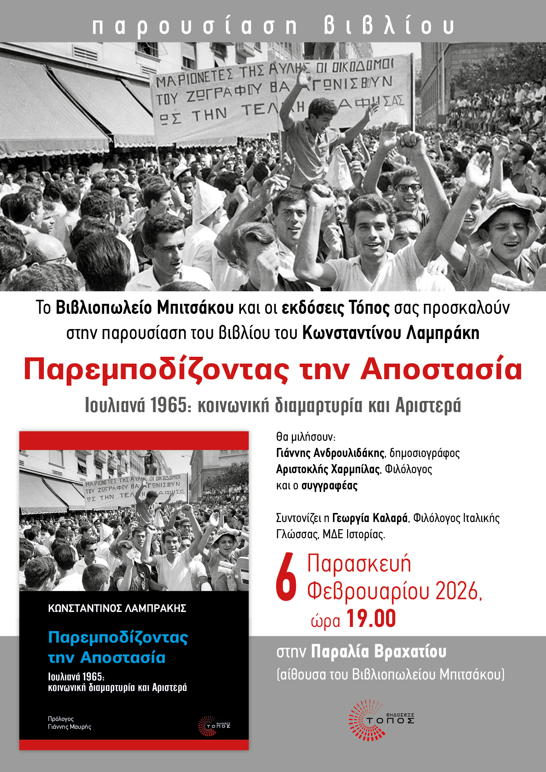 ::. Παρασκευή 6 Φεβρουαρίου, Βραχάτι Κορινθίας: "Παρεμποδίζοντας την Αποστασία / Ιουλιανά 1965: κοινωνική διαμαρτυρία και Αριστερά" παρουσίαση του βιβλίου του Κωνσταντίνου Λαμπράκη (16-01-2026 14:45)