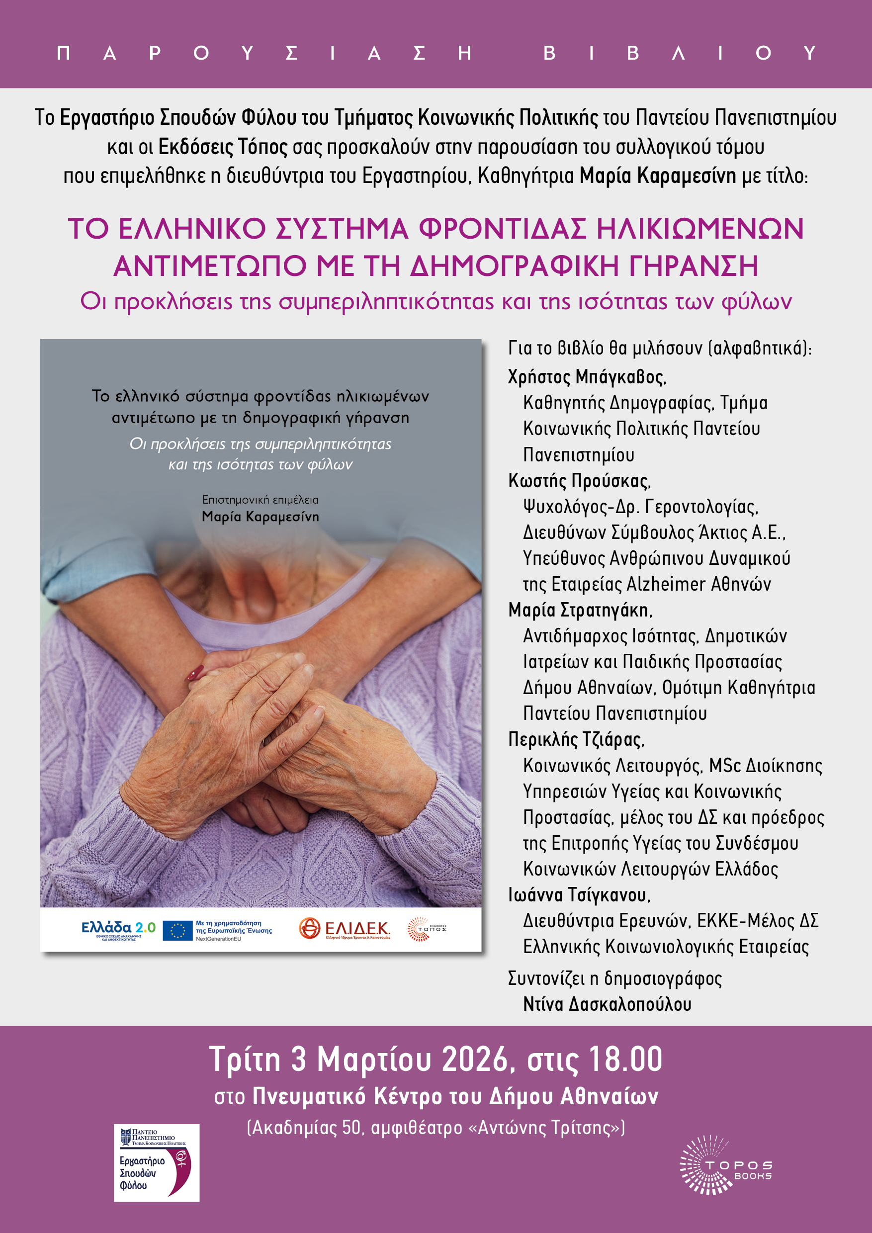 ::. Τρίτη 3 Μαρτίου, Αθήνα: "Το ελληνικό σύστημα φροντίδας ηλικιωμένων αντιμέτωπο με τη δημογραφική γήρανση" παρουσίαση του συλλογικού βιβλίου σε επιμέλεια Μαρίας Καραμεσίνη (27-02-2026 14:32)