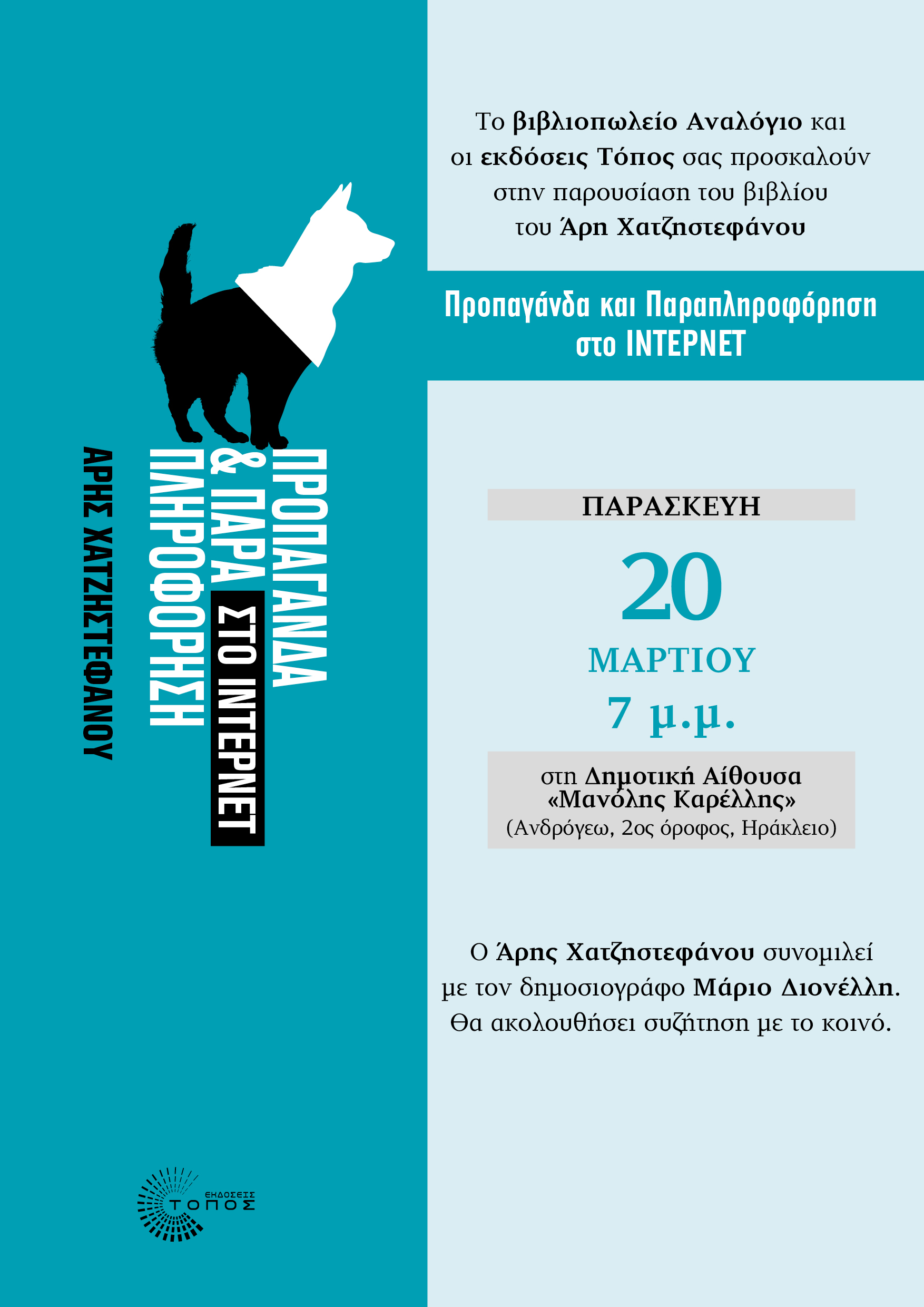 ::. Παρασκευή 20 Μαρτίου, Ηράκλειο: "Προπαγάνδα και παραπληροφόρηση στο Ίντερνετ" παρουσίαση του νέου βιβλίου του Άρη Χατζηστεφάνου (04-03-2026 13:06)