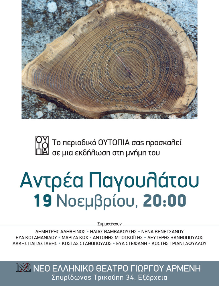 ::. Το περιοδικό ''Ουτοπία'' σας προσκαλεί σε μια εκδήλωση στη μνήμη του Αντρέα Παγουλάτου (Τετάρτη 19 Νοεμβρίου) (18-11-2014 13:50)