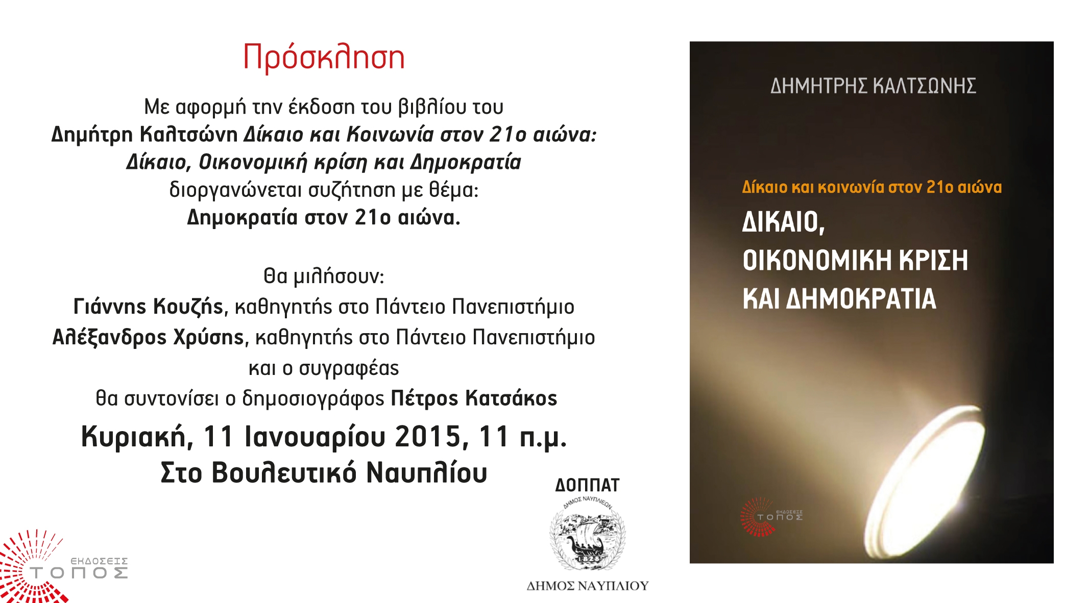 ::. Εκδήλωση με αφορμή το βιβλίο ''Δίκαιο και κοινωνία στον 21ο αιώνα'' στο Ναύπλιο, την Κυριακή 11 Ιανουαρίου (08-01-2015 14:41)