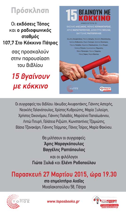 ::. ''15 βγαίνουν με κόκκινο'': Παρουσίαση του βιβλίου την Παρασκευή 27 Μαρτίου στην Πάτρα (18-03-2015 11:24)