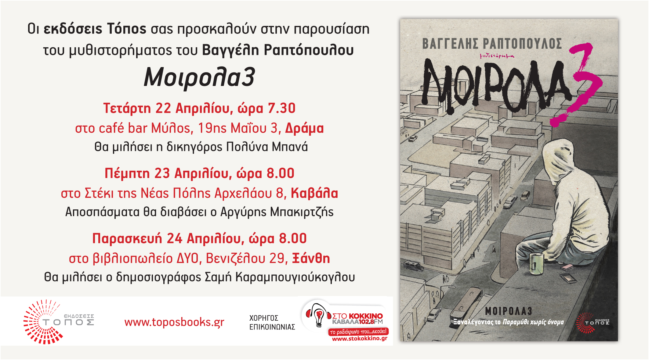 ::. ''Μοιρολα3'' : παρουσίαση του βιβλίου του Β. Ραπτόπουλου στη Δράμα (22.04), την Καβάλα (23.04) και την Ξάνθη (24.04) (16-04-2015 14:22)
