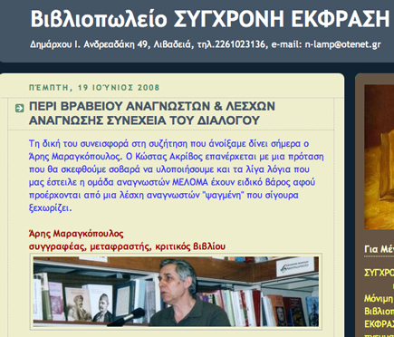 Το μπλογκ του καλού βιβλιοπωλείου Σύγχρονη Έκφραση στη Λειβαδιά, αμέσως μετά τη Διεθνή Έκθεση Βιβλίου στη Θεσσαλονίκη, άνοιξε μια συζήτηση για το λεγόμενο Βραβείο Αναγνωστών το οποίο εδώ και μερικά χρόνια απονέμει το ΕΚΕΒΙ. Δείτε τη συνεισφορά του προσκεκλημένου Άρη Μαραγκόπουλου στη συζήτηση αυτή. Μια συζήτηση, η οποία, κατά τον συγγραφέα, δύσκολα μπορεί να επηρεάσει τη θλιβερή κατάσταση της ανάγνωσης (δηλαδή της εν γένει καλλιέργειας που απαιτείται ως προϋπόθεση ώστε η ανάγνωση να έχει νόημα). Παραθέτουμε εδώ το τέλος της απάντησης του Ά.Μ. Ολόκληρη την απάντηση διαβάστε τη (και σχολιάστε την) εδώ.