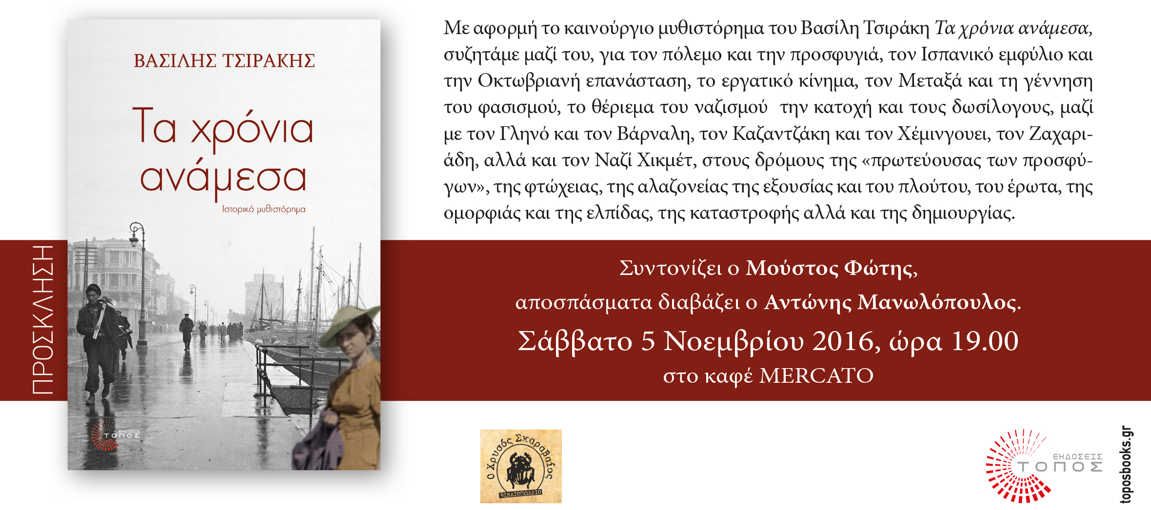 ::. Σάββατο 5 Νοεμβρίου: ''Τα χρόνια ανάμεσα'', παρουσίαση του μυθιστορήματος του Βασίλη Τσιράκη στην Καρδίτσα (01-11-2016 17:21)