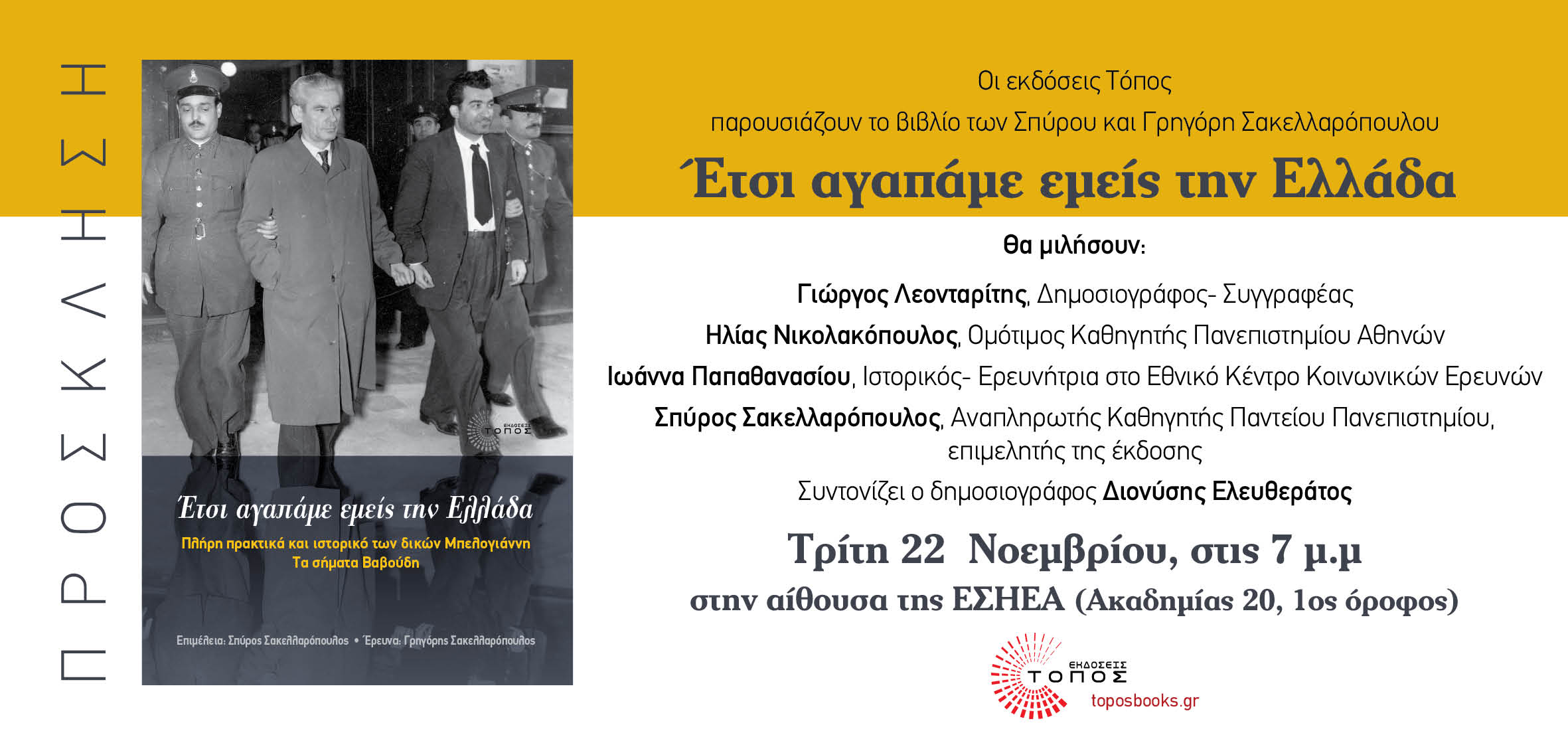 ::. ''Έτσι αγαπάμε εμείς την Ελλάδα'': παρουσίαση του βιβλίου του Σ. Σακελλαρόπουλου στην ΕΣΗΕΑ την Τρίτη 22 Νοεμβρίου (10-11-2016 13:50)