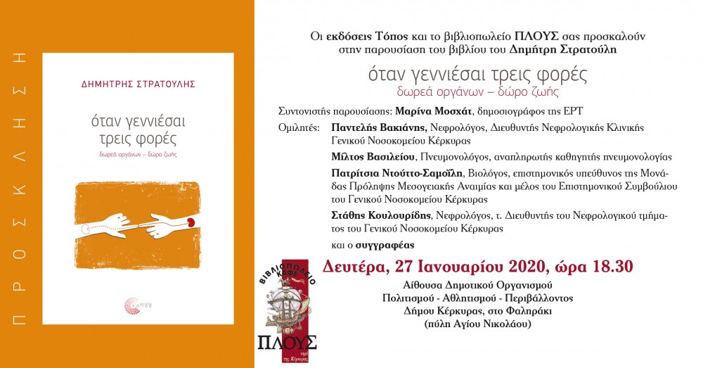 ::. '''Οταν γεννιέσαι τρεις φορές'': παρουσίαση του νέου βιβλίου του Δημήτρη Στρατούλη στην Κέρκυρα, Δευτέρα 27 Ιανουαρίου (07-01-2020 17:09)