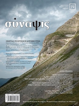 Στο τεύχος 72 του περιοδικού ΣΥΝΑΨΙΣ το βασικό αφιέρωμα αφορά στο θέμα «Πολιτισμός και Ψυχική Υγεία» βασισμένο στην επετειακή εκδήλωση της Α΄ Ψυχιατρικής Κλινικής του ΑΠΘ – Γ.Ν.Θ. Παπαγεωργίου 23/2/2024. (80 χρόνια από την ίδρυση Ψυχιατρικλης και Νευρολογικής Κλινικής στο ΑΠΘ – 40 χρόνια από το διαχωρισμό της Ψυχιατρικής από τη Νευρολογία, 20 χρόνια πό τη μεταφορά της Α΄ Ψυχιατρικής Κλινικής στο Γ.Ν.Θ. Παπαγεωργίου. Επίσης υπάρχει αφιέρωμα στην ψυχική υγεία των εφήβων και όπως πάντα βιβλιοκρισίες. Συγγραφείς του τεύχους κατά σειρά δημοσίευσης: Γιάννης Διακογιάννης, Αικατερίνη Γιαζκουλίδου, Βασιλική Χολέβα, Παναγιώτα Καραμούζη, Ελένη Μπόντη, Παύλος Βασιλειάδης, Στυλιανός Φαρσαλιώτης, Γρηγόρης Αμπατζόγλου, Γιώργος Χ. Παπαδόπουλος, Στέλιος Στλιανίδης, Μανώλης Δάλας, Δημοσθένης Αγραφιώτης, Δημήτρης Πλουμπίδης, Γιώργος Βασιλάκος, Θανάσης Καράβατος, Κώστας Πόταγας.