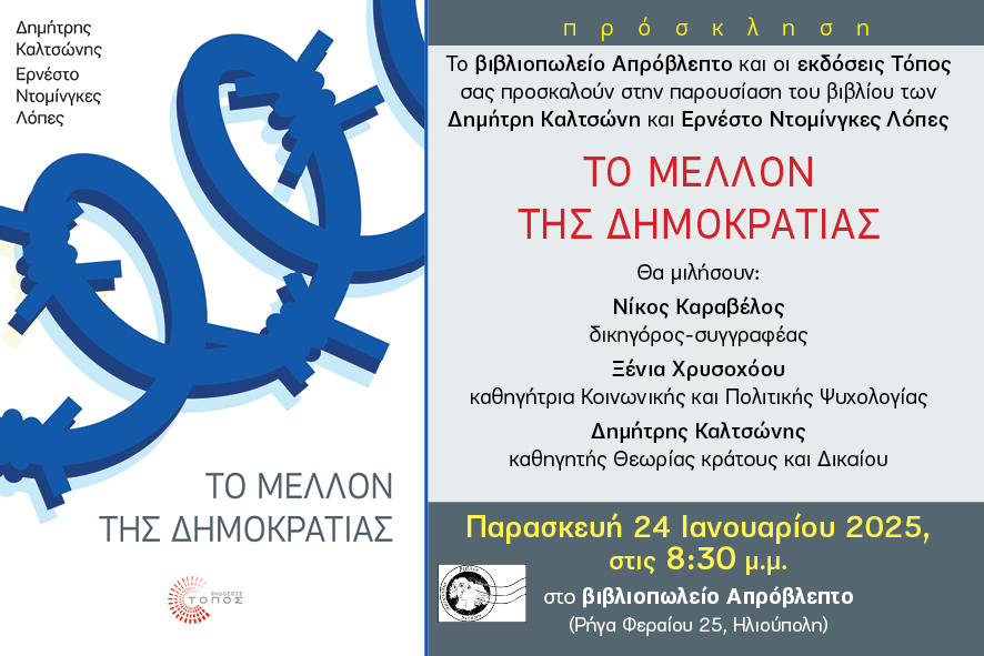 ::. Παρασκευή 24 Ιανουαρίου: ''Το μέλλον της Δημοκρατίας'' παρουσίαση του βιβλίου των Δημήτρη Καλτσώνη και Ερνέστο Ντομίνγκες Λόπες στην Ηλιούπολη (10-01-2025 16:13)