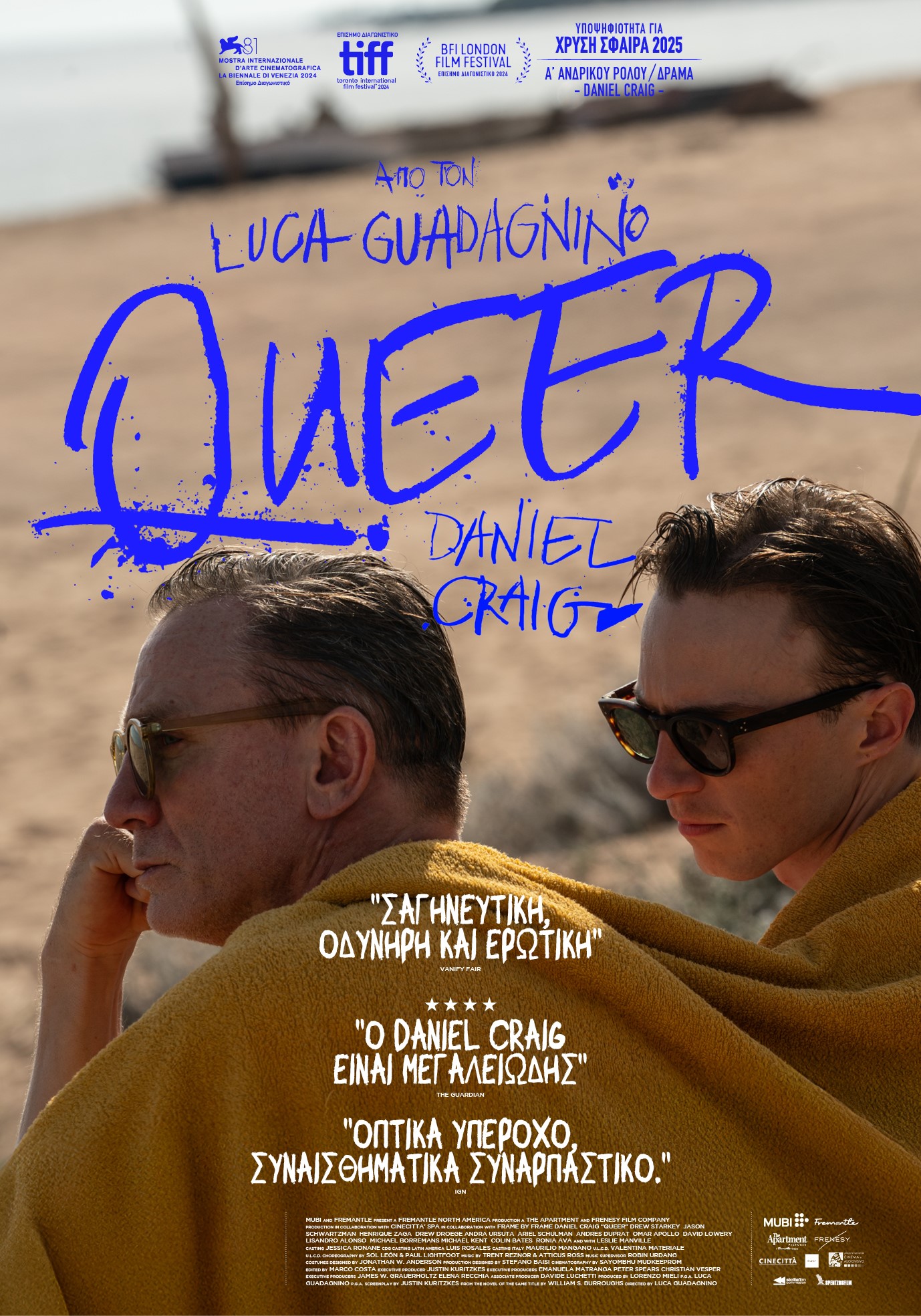 Το πολύκροτο μυθιστόρημα του Γουίλιαμ Μπάροουζ τυχαίνει φαντασμαγορικής διασκευής από τον διαρκώς απρόβλεπτο Ιταλό σκηνοθέτη Λούκα Γκουαντανίνο (Call me by your name, Challengers, Io Sono l’Amore), ο οποίος κατορθώνει να συλλάβει το πνεύμα του συγγραφέα και να υπογράψει ένα γοητευτικό κινηματογραφικό παράδοξο, με έξοχο πρωταγωνιστή του τον Ντάνιελ Κρεγκ. Η ταινία προβλήθηκε στο διαγωνιστικό τμήμα του Φεστιβάλ της Βενετίας, ενώ απέσπασε Υποψηφιότητα για τις Χρυσές Σφαίρες 2025, Α’ Ανδρικού Ρόλου για τον Ντάνιελ Κρεγκ αλλά και για τα επερχόμενα Critics Choice Awards 2025, μεταξύ άλλων βραβείων και κριτικών.