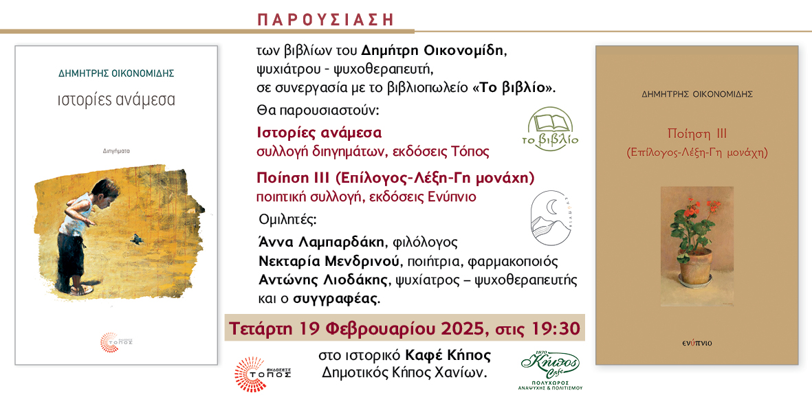 ::. Τετάρτη 19 Φεβρουαρίου: ''Ιστορίες ανάμεσα'' παρουσίαση του βιβλίου του Δημήτρη Οικονομίδη στα Χανιά (17-01-2025 12:04)