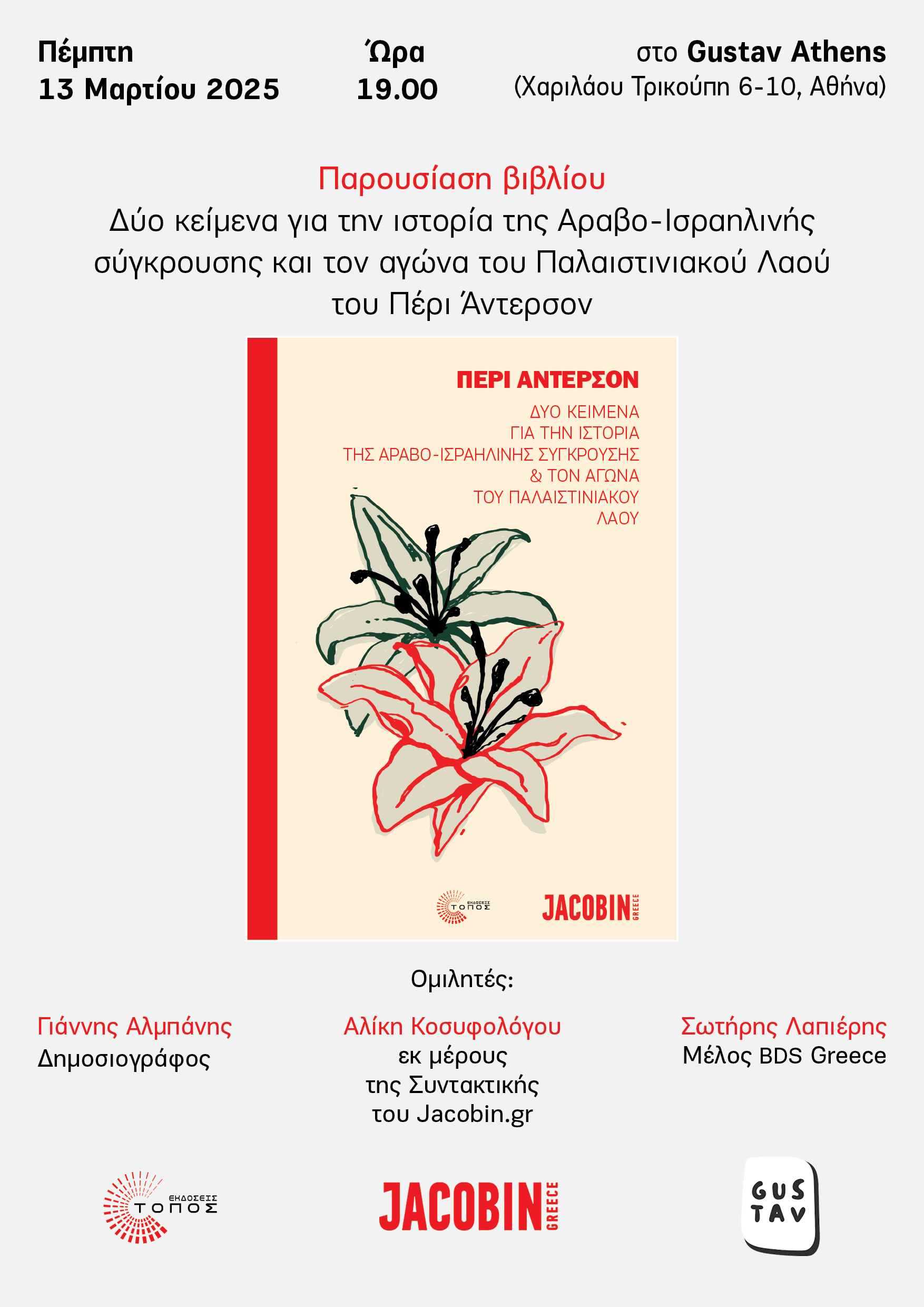 ::. Πέμπτη 13 Μαρτίου: ''Δύο κείμενα για την ιστορία της Αραβο-Ισραηλινής σύγκρουσης και τον αγώνα του Παλαιστινιακού λαού" παρουσίαση του βιβλίου στην Αθήνα (06-03-2025 14:51)