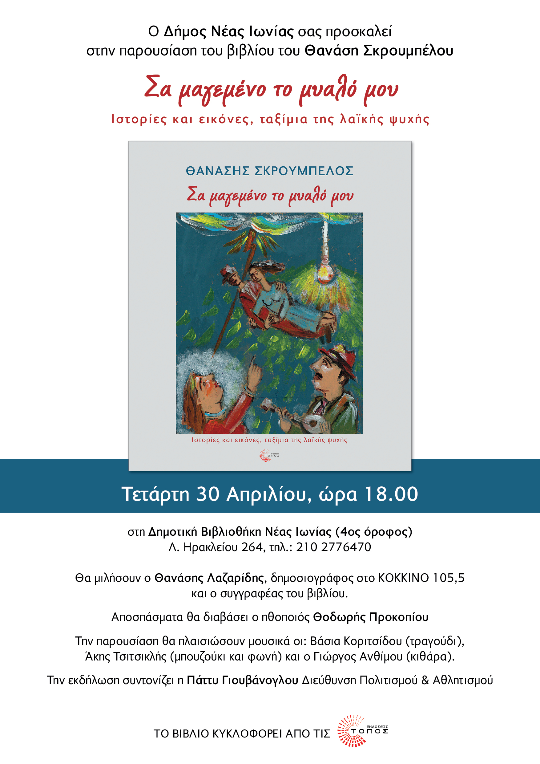 ::. Τετάρτη 30 Απριλίου: "Σα μαγεμένο το μυαλό μου" παρουσίαση του βιβλίου του Θανάση Σκρουμπέλου στη Νέα Ιωνία (14-04-2025 15:28)