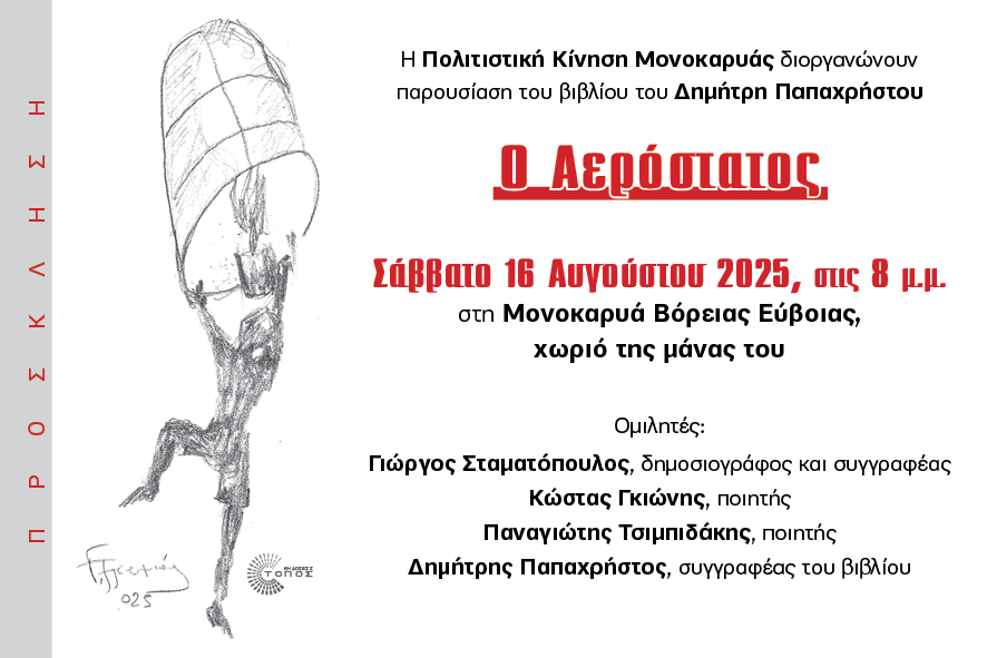 ::. Σάββατο 16 Αυγούστου: "Ο Αερόστατος" παρουσίαση του βιβλίου του Δημήτρη Παπαχρήστου στην Εύβοια (04-08-2025 11:43)