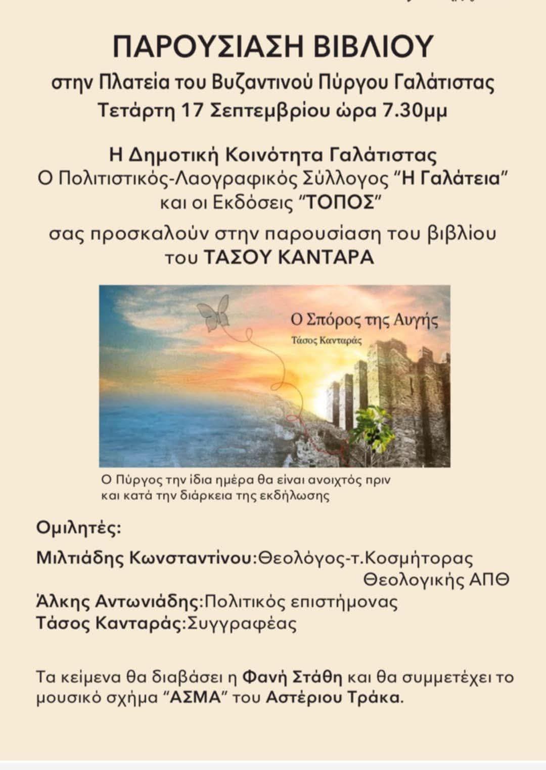 ::. Τετάρτη 17 Σεπτεμβρίου, Χαλκιδική: ''Ο Σπόρος της Αυγής' παρουσίαση του νέου βιβλίου του Τάσου Κανταρά (16-09-2025 14:30)