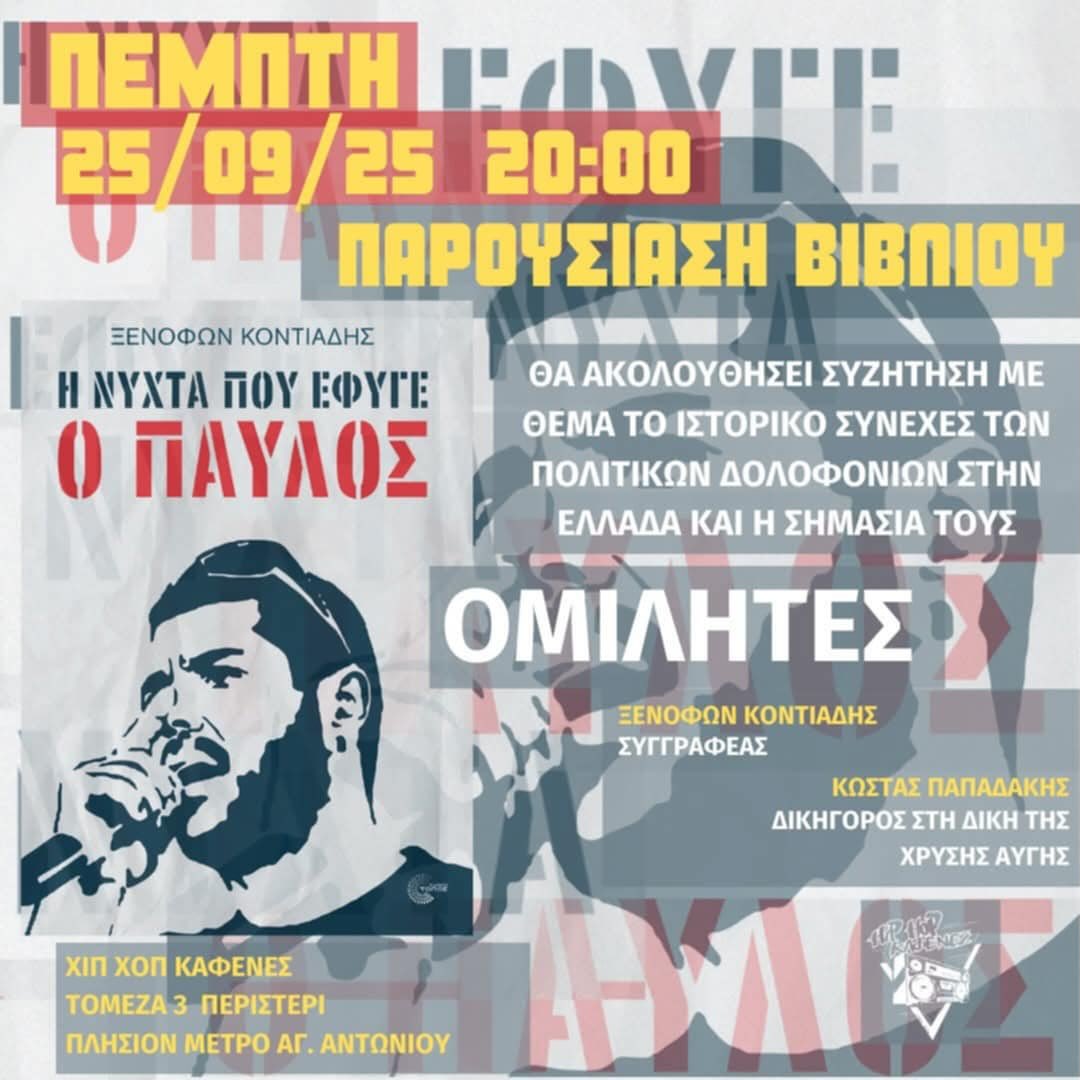 ::. Πέμπτη 25 Σεπτεμβρίου, Περιστέρι: "Η νύχτα που έφυγε ο Παύλος" παρουσίαση του βιβλίου του Ξενοφώντα Κοντιάδη (19-09-2025 15:16)